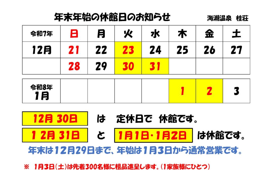 年末年始の営業についてお知らせします。来年度も引き続き桂荘においでいただきますようよろしくお願いいたします。